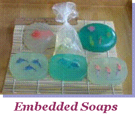 Every bar of my soap is 100% pure made with only the finest natural vegetable oils. All of the products are cruelty free, and with the exception of any soap that contains milk, honey or beeswax, the products are animal-product free. No detergents, surfactants, or sulfates and no preservatives. The soap is hypo-allergenic and non-drying to the skin. Ingredients: Saponified vegetable oils (mainly olive and coconut oils), glycerin, purified water, moisturizers, emulsifiers, color and fragrance. The colors are natural or FDA food or cosmetic grade. The scents are essential oils and FDA approved cosmetic grade scents. Some bars may contain one or more of the following ingredients: almond oil, cocoa, cocoa butter, coconut, coconut oil, coffee, cow's milk, goat’s milk, honey, lecithin, oatmeal, olive oil, shea butter, tea tree oil, and/or Vitamin E. (Oh, and occasionally, a plastic fish!) The soaps are created under sanitary conditions, in a smoke-free and animal-free environment. All bars are individually crafted by hand. Each bar is hand finished and individually double wrapped. In nearly every case, you may select any color or fragrance in the bar shape of your choice. You may also request light or heavy scent, and of course, unscented. With the exception of my exclusive Oatmeal bars, any of the soaps can be colored to your specifications. (Oatmeal bars may be colored, but we can’t guarantee the results.) I use these basic soap formulas (also offer goat’s milk, olive oil, castile, etc.): "Clear" Glycerine Soap, which is a "Natural" formula with 20% added Glycerine. It is 100% pure soap with mainly coconut oil used. This soap is transparent, and can be tinted as you desire. "White" Glycerine Soap, which is very similar to the "clear" but is opaque white. When color is added, the results are a creamy colored soap. "Oatmeal Milk and Honey" Glycerine Soap, which is a great exfoliating soap with a wonderful scent and lather. My recipe adds pure honey, milk and finely ground oatmeal to the bars. And they smell delicious! This is also the basis for my special Pineapple Coconut Milk & Honey bar. Available fragrances/formulas are: Baby Powder Prices vary, but the soap is basically $1.00 per ounce. Use the following as a guide: LARGE BARS (Average weight is 4-7 ounces): Various shaped soaps in all sizes are available.